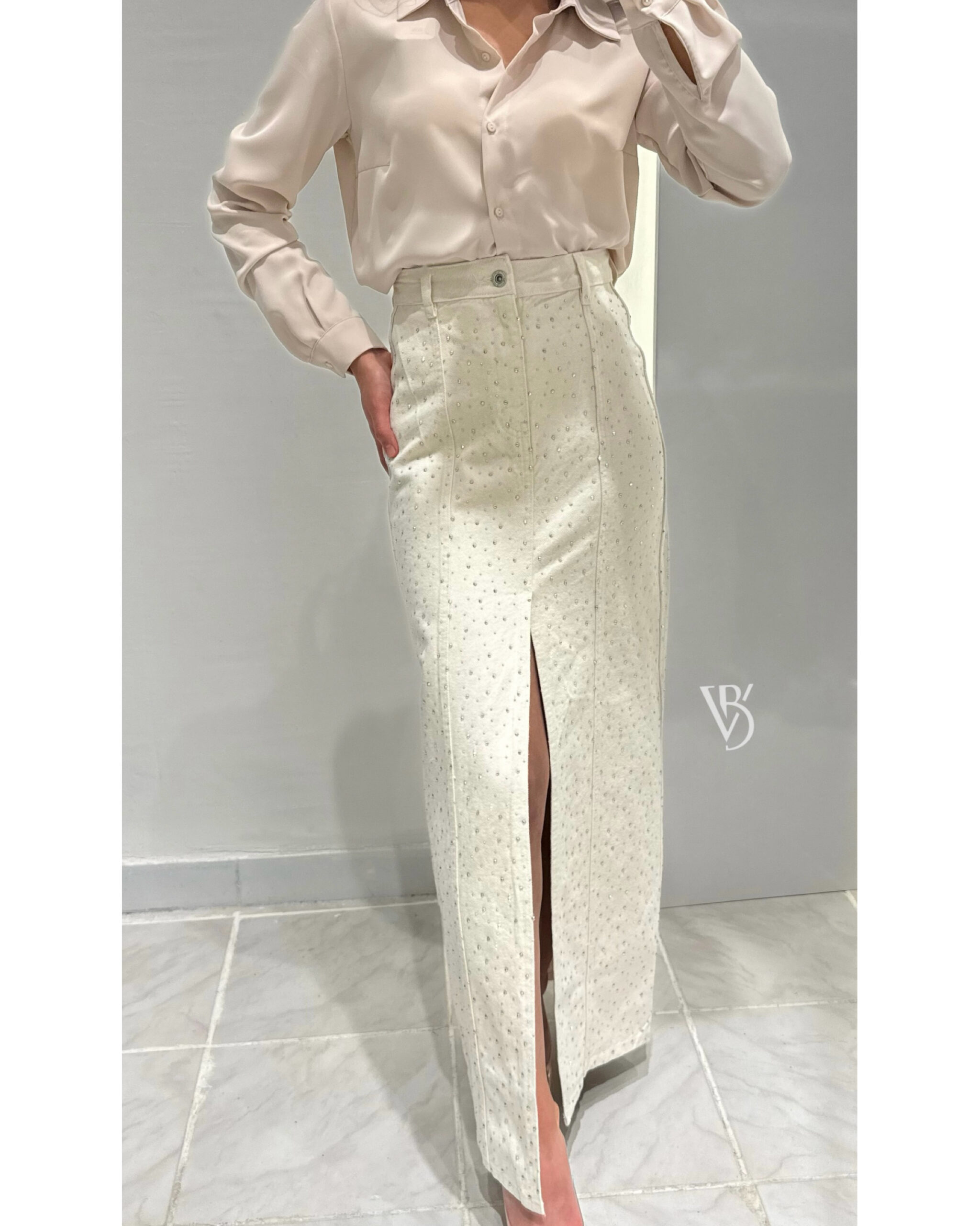 Robin Taşlı Yırtmaç Detay Midi Etek -BEJ